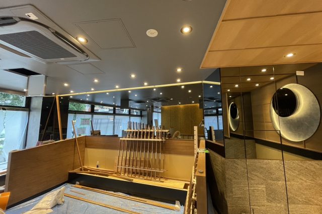 赤坂カフェ施工施工ミラー面棒付け内装仕上げ建具製作造作家具店舗施工一人親方募集職人さん募集業務委託契約内装仕上工事業施工管理横浜市横浜市港北区こんにちは。 株式会社畑中インテリアです。 先日、赤坂のカ